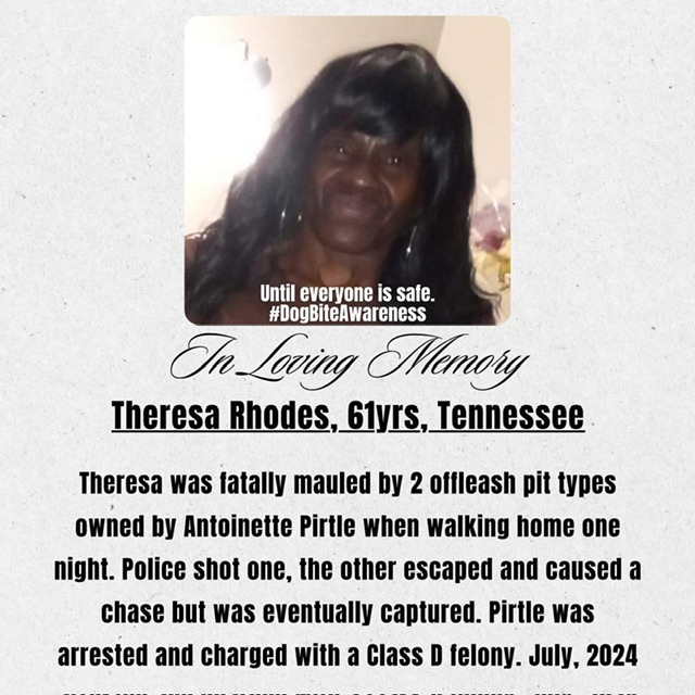 Police arrived on scene during the attack. The dogs were so vicious, police could not assist the victim. An officer shot at the dogs in desperation, hitting one. Both dogs ran away. The officers rushed to help Theresa, but she was gone. ☹️