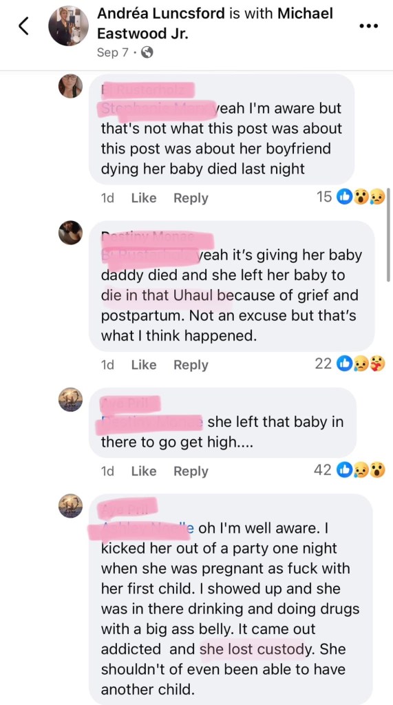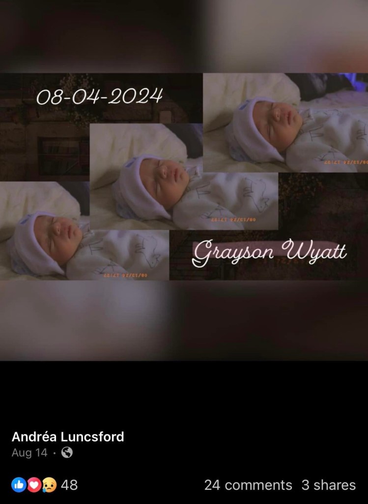 Andrea attended his funeral with a uhaul. Soon after, Grayson was found non responsive in the same uhaul. The baby did not survive. 💔
