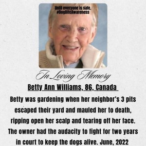 Betty, may you rest in peace. 🪦 May you be in a place where you can enjoy a beautiful garden and never have to feel the suffering you experienced at the jaws of these animals. May we all stand strong like Justice Bruce and refuse to submit to these entitled abusers who bring dangerous animals into our communities and show no remorse or change after an attack.