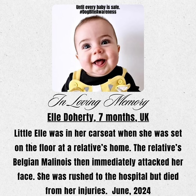 Sweet Elle was 7 months old on June 16th when her family strapped into her safely into a carseat and brought her to visit another home. As she was set onto the floor (because every decent caregiver knows NOT to place a car seat on an elevated surface), the homeowner’s Malinois went straight for her face, severely mauling her.