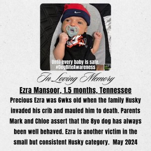 Sweet, precious, 6 week old Ezra was sleeping in his crib when the parentsโ 8 year old husky mauled him. He was rushed to East Tennessee Childrenโs hospital in critical condition, intubated with brain swelling. Unfortunately, he died from the injuries sustained during the attack.