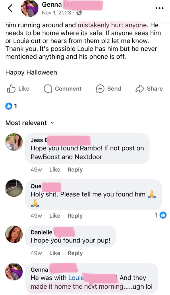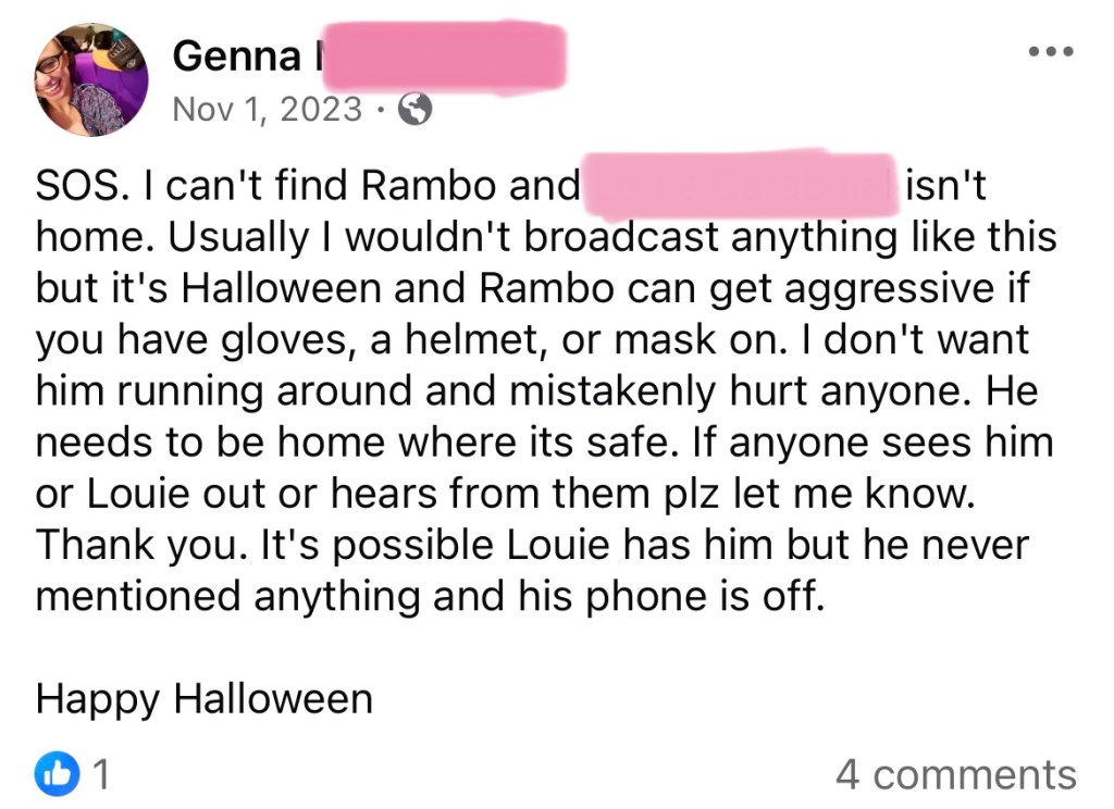 So Rambo is only shared here for thoroughness and no claim is made about its involvement. The earliest reports on social media by neighbors claimed that the primary predator was a Pit-Irish Wolfhound mix that had recently been rescued.