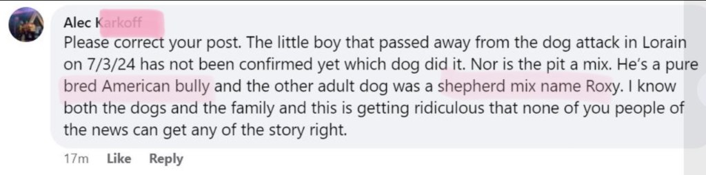 Little Jaxson was pronounced at the scene. 😞 The Lorain County dog warden did not respond to this call and we have no details as to why. The Lorain County Sheriff department partnered with the Friendship Animal Protective League to remove the two attacking dogs and their litter of puppies, 6 pups estimated to be 4 months old. (Social media shows several extended relatives openly bred large breed dogs as well, another factor often found in these cases.)