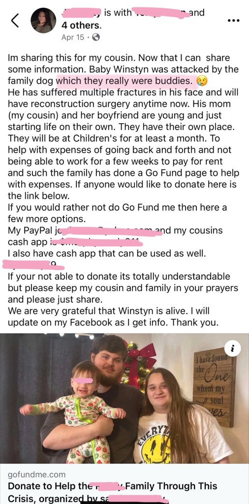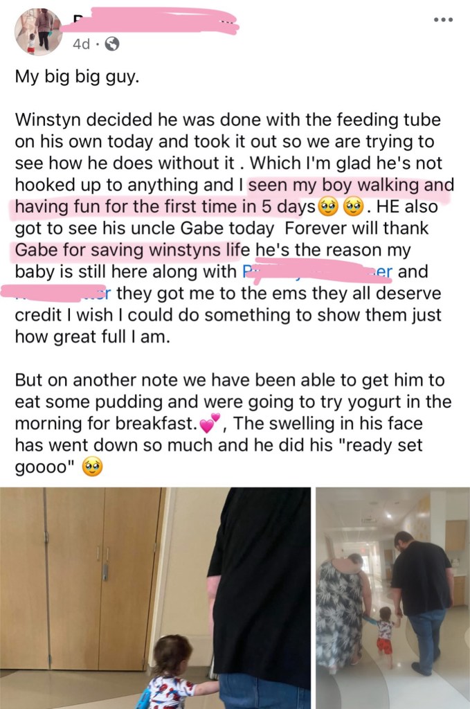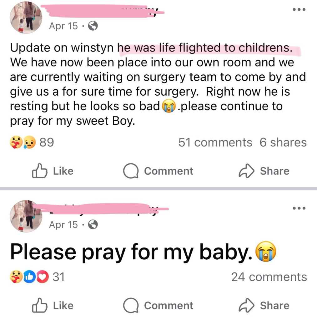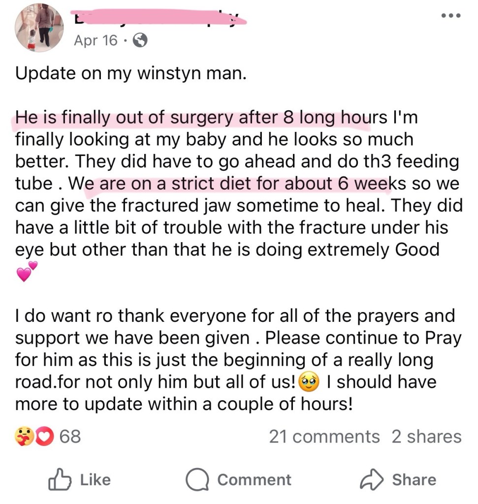 Baby Winstyn is alive today because a relative was strong 💪 enough to temporarily stop the pitbull during the attempted murder. He was life flighted 🚁 to the big Children’s hospital and underwent a complicated, 8hr surgery.