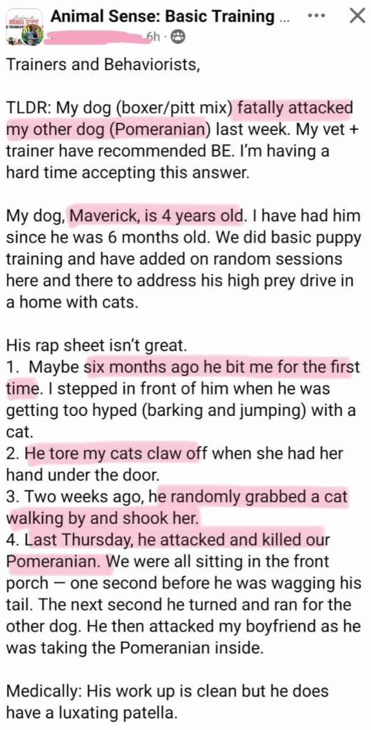 The owner’s professional dog trainer recommended immediate dispatch, the gold standard in response to this level of aggression. But instead of accepting the professional advice and protecting others, the owner went to a pit bull Facebook group to ask: