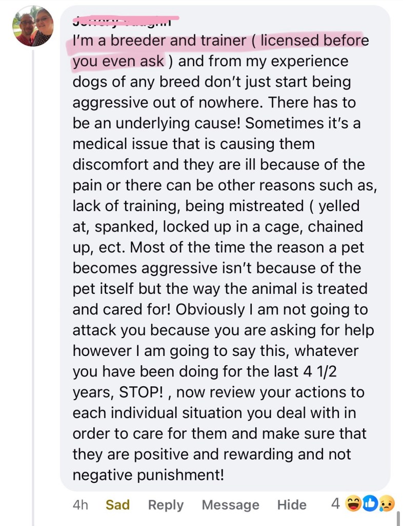 • Shifts focus from dangerous breed traits to the commenter’s feelings. It reframes accountability as “judgment” to avoid addressing the issue. It also conveniently ignores that Jeffrey is a breeding who intentionally creates these dogs. Notice his language.