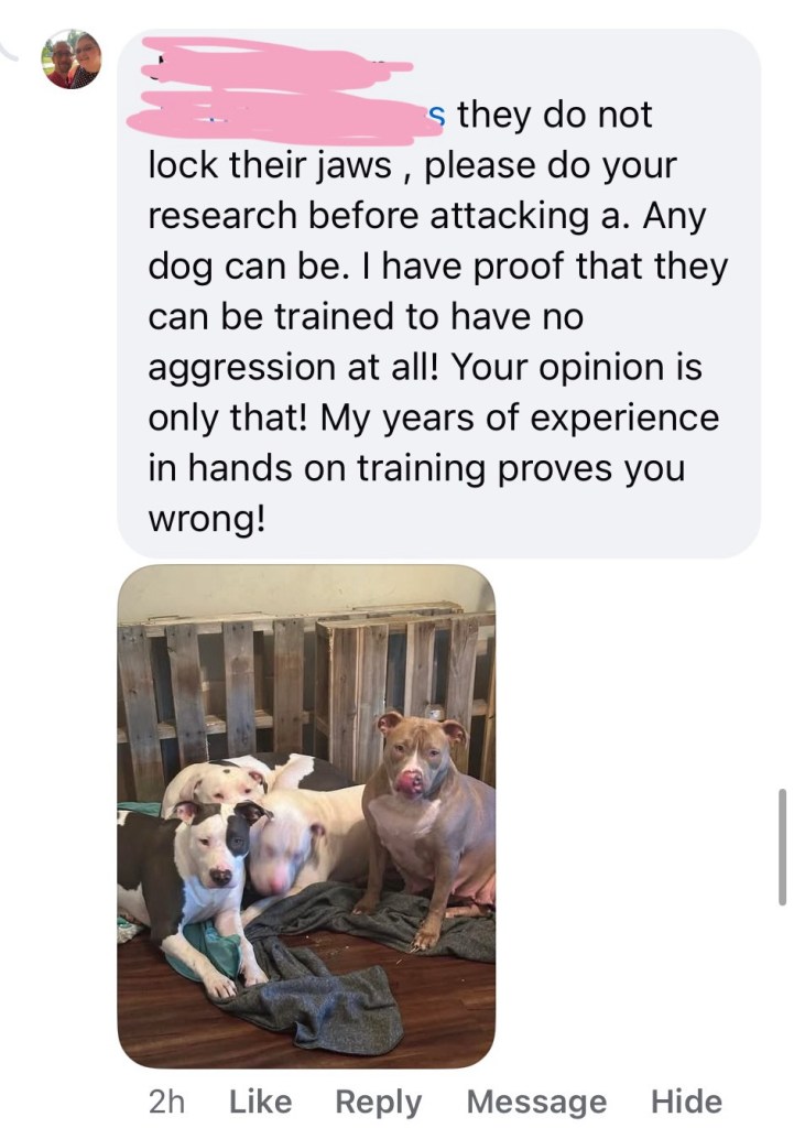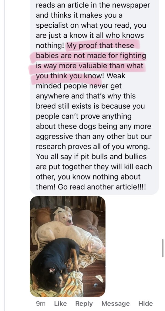 9. “…because you people can’t prove anything about these dogs being any more aggressive than any other but our research proves all of you wrong.”