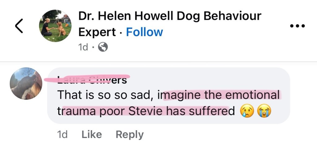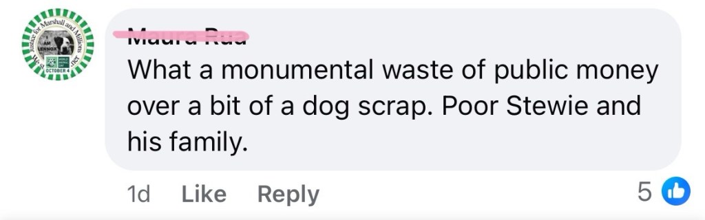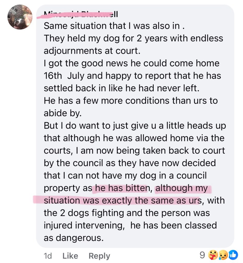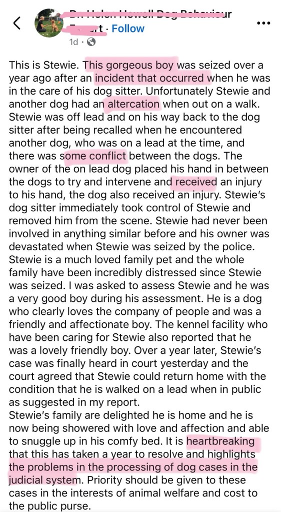 • 𝗗𝗲𝗺𝗮𝗻𝗱𝗶𝗻𝗴 𝗲𝗻𝘁𝗶𝘁𝗹𝗲𝗺𝗲𝗻𝘁. The author portrays the court’s involvement as an injustice: “heartbreaking,” “a year to resolve,” “animal welfare should come first.” The dog’s right to comfort is centered over the public’s right to safety and the victims’ right to justice.