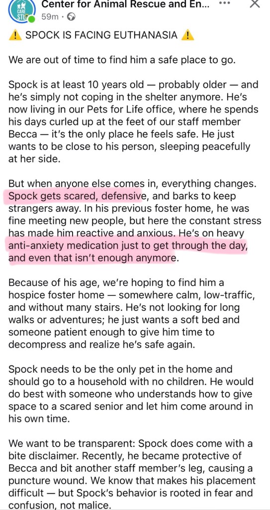 But when anyone else comes in, everything changes. Spock gets scared, defensive, and barks to keep strangers away. In his previous foster home, he was fine meeting new people, but here the constant stress has made him reactive and anxious. He’s on heavy anti-anxiety medication just to get through the day, and even that isn’t enough anymore.