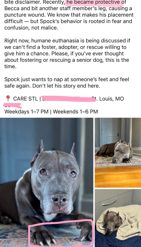 The ad does not disclose the breed, though CARE STL’s population primarily consists of pit bull type dogs.