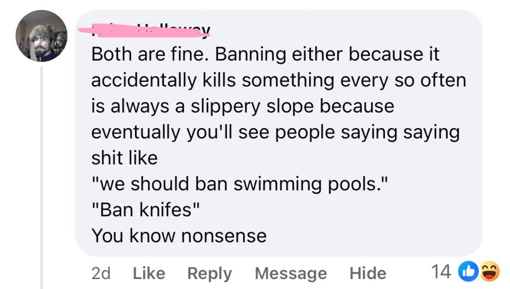 “Both are fine. Banning either because it accidentally kills something every so often is always a slippery slope because eventually you’ll see people saying saying shit like