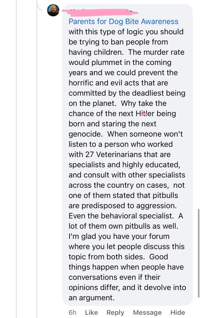 A recent comment under a news story about two pitbulls killing a smaller pet is a perfect example. Instead of addressing the dog attack, the commenter launched into a tangent about how “with your logic, we should ban children because the murder rate would plummet” and brought up Hitl&/. By the end, they insisted that they had worked with 27 veterinarians who said pitbulls are not predisposed to aggression.