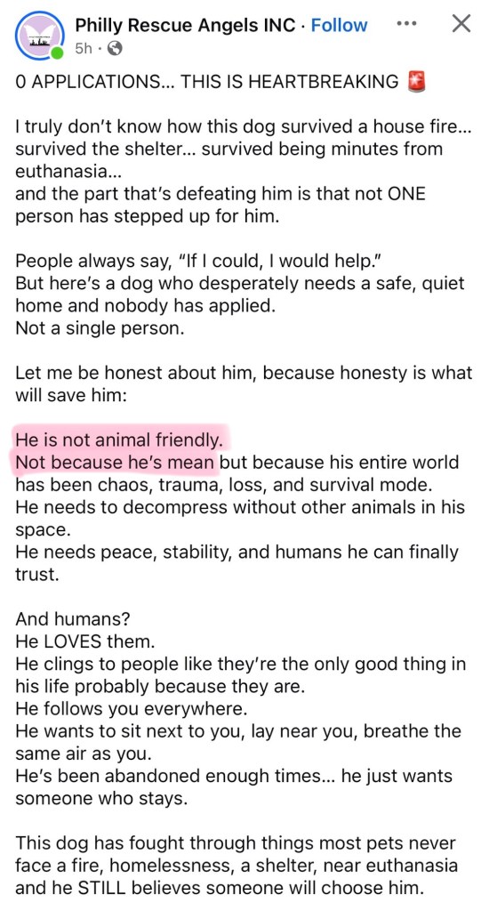 This is textbook trauma bonding language and replicates the same emotional button pushing used in toxic relationship cycles. It’s often known as love bombing. The adopter is cast not as a pet owner, but as the only person capable of saving a broken soul.