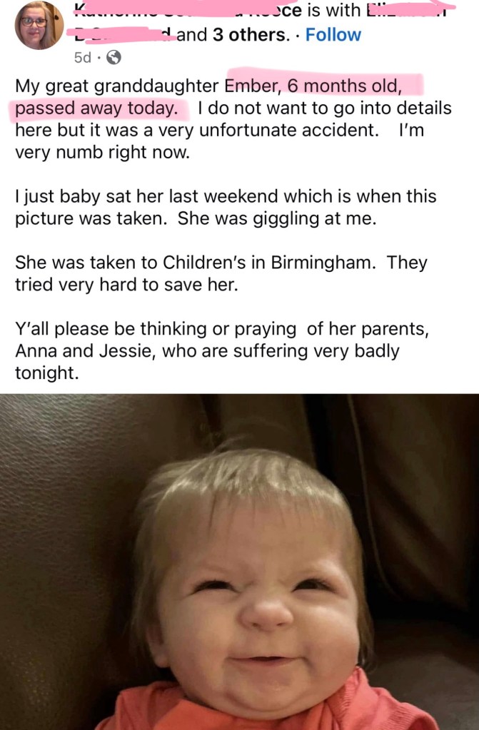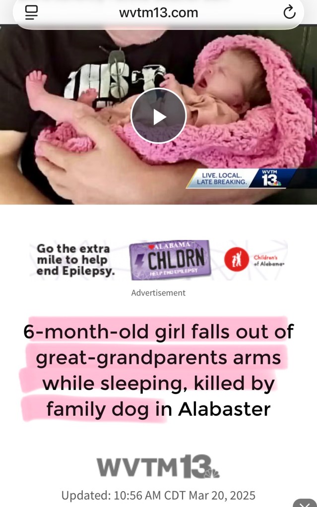 Ember’s mother disclosed that she was taking Grandma to a medical appointment and left her baby in the care of Great-Grandma. It’s alleged that Great-Grandma fell asleep on the couch while holding Ember very soon after the mom left. It’s then alleged that Ember accidentally fell out of her arms and began crying, which caused the 11 year old family pit to maul her. 💔