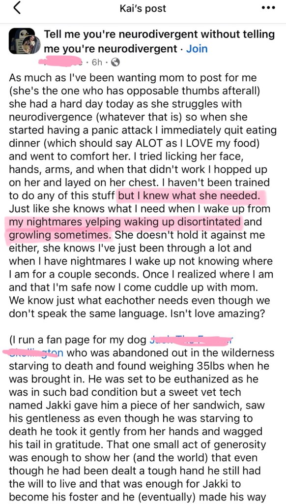 If you’re projecting your emotional needs onto a dog whose lineage was designed for combat, that’s not neurodivergence. That’s unresolved trauma calling for treatment, not a “miracle bond.” If you’re exploiting an abused and abandoned dog on monetized social media and marketing it in groups of neurodivergent and vulnerable people, that’s another topic altogether.