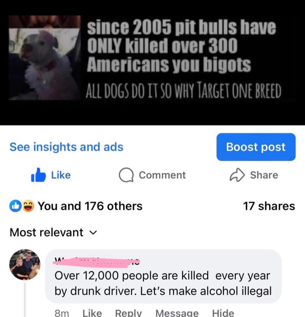 This mirrors how dog attack discussions often devolve, with shouts that “Rottweilers attack, too!” Or “Chihuahuas are the worst!” The consequence: responsibility shifts from the high risk actor (dog/owner or drunk driver) to other topics as a distraction.