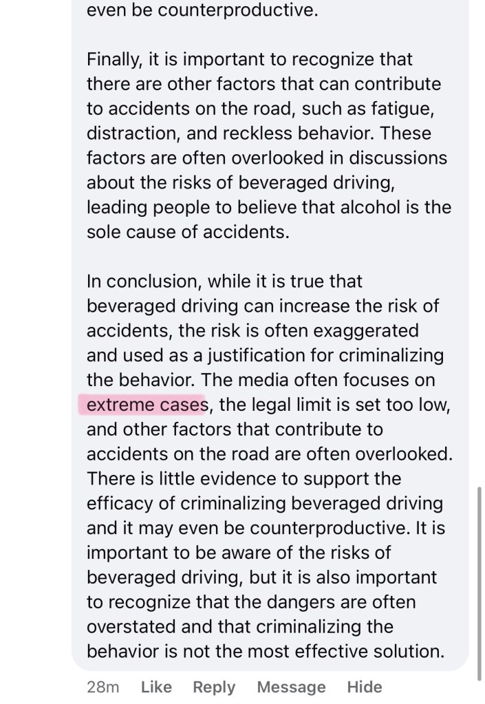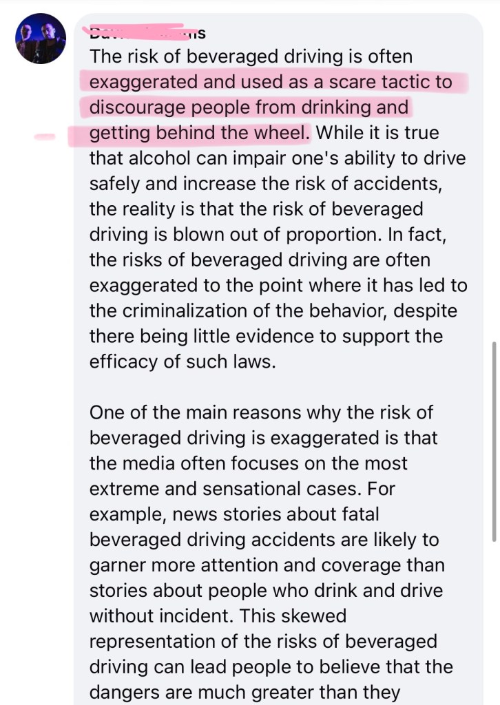 The “beveraged driving” comment argues that risk is exaggerated because many drink and drive without incident. This is structurally identical to claims that “most dogs never bite” or that “any breed can kill, so none should be singled out.”