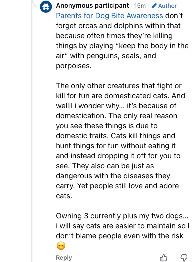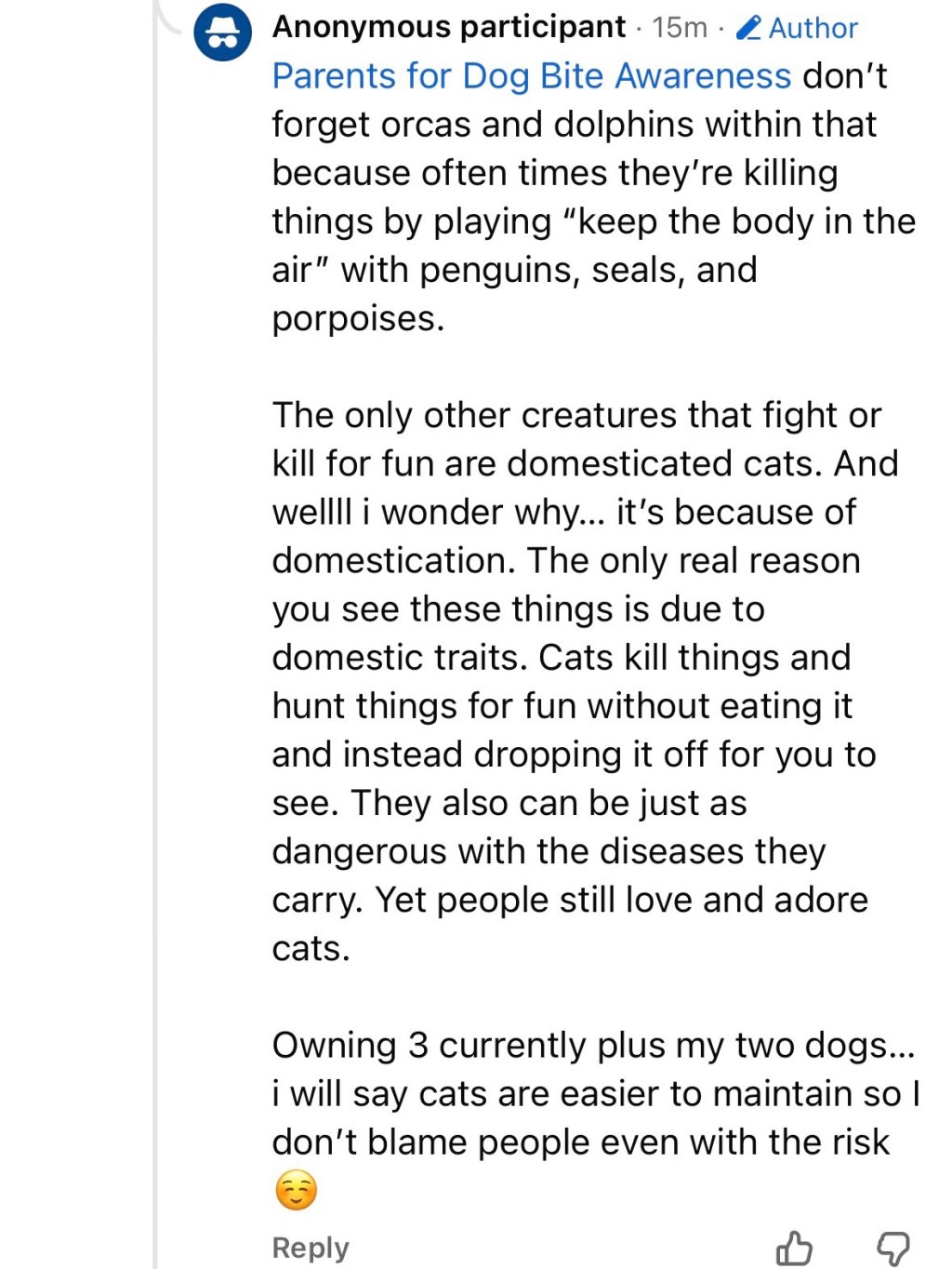 Instead of engaging the real issue (why fighting breed attacks cause disproportionate maiming and deaths) the commenter drags in random animals to muddy the water.