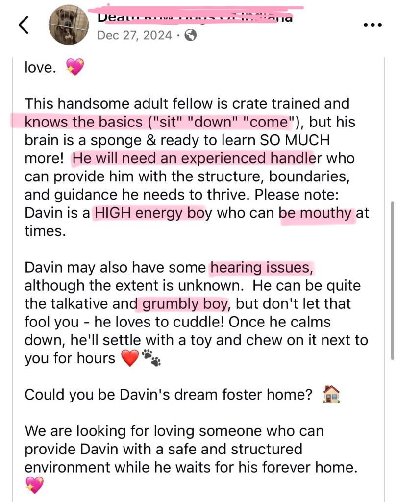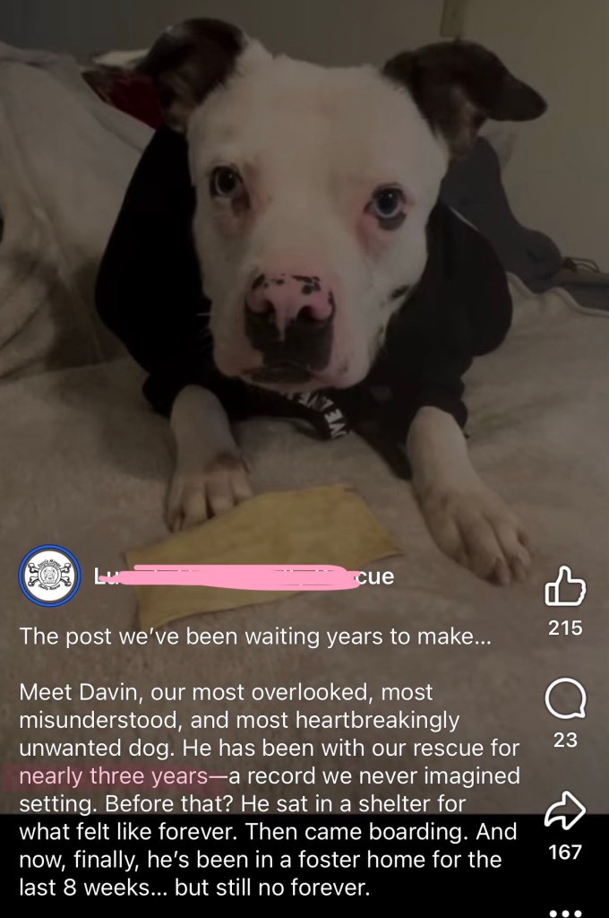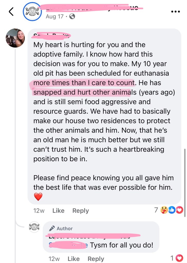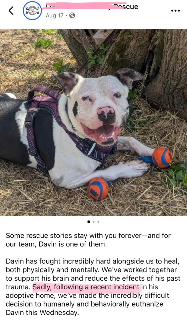 The rescue has been blanked as a courtesy and I ask you to extend it as well. Despite the other details, the organization has publicly acknowledged humane dispatch and they also did it versus making the new owner do it. The purpose of posting Davin’s case is to highlight the power of hereditary genetics.