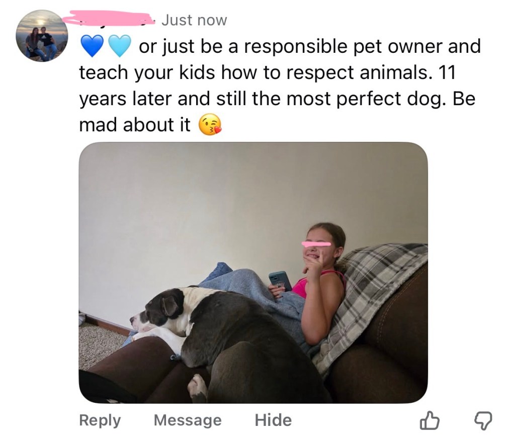 “💙🩵 or just be a responsible pet owner and teach your kids how to respect animals. 11 years later and still the most perfect dog. Be mad about it 😘”